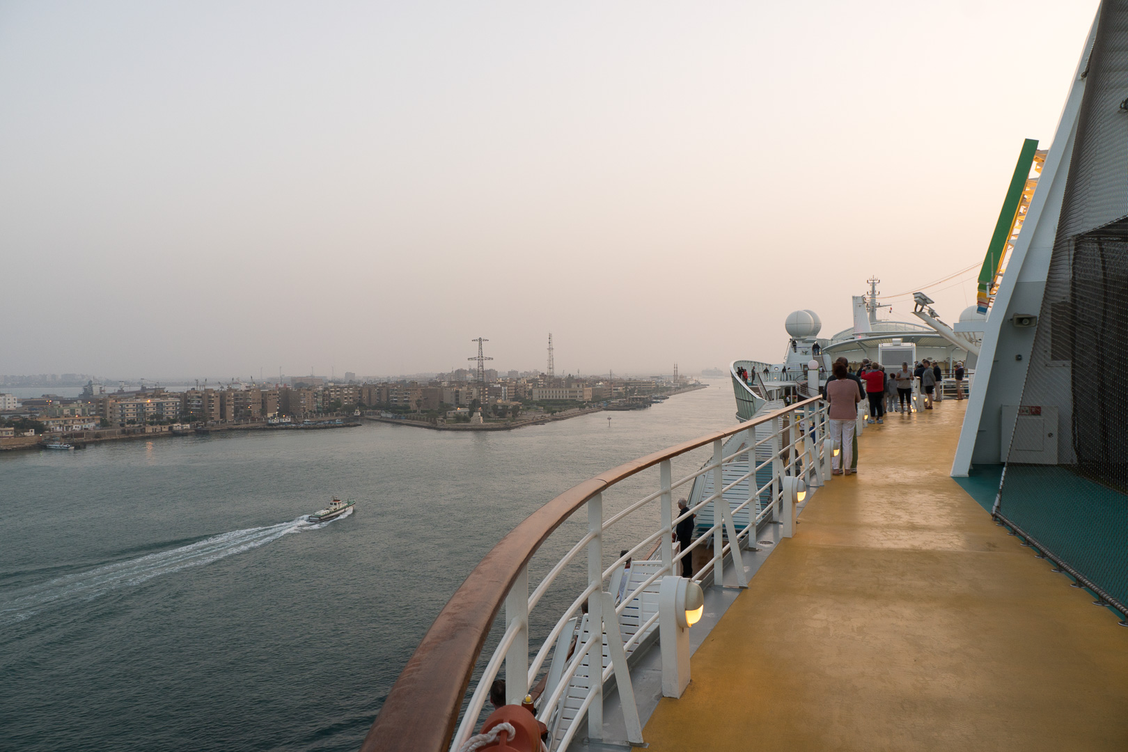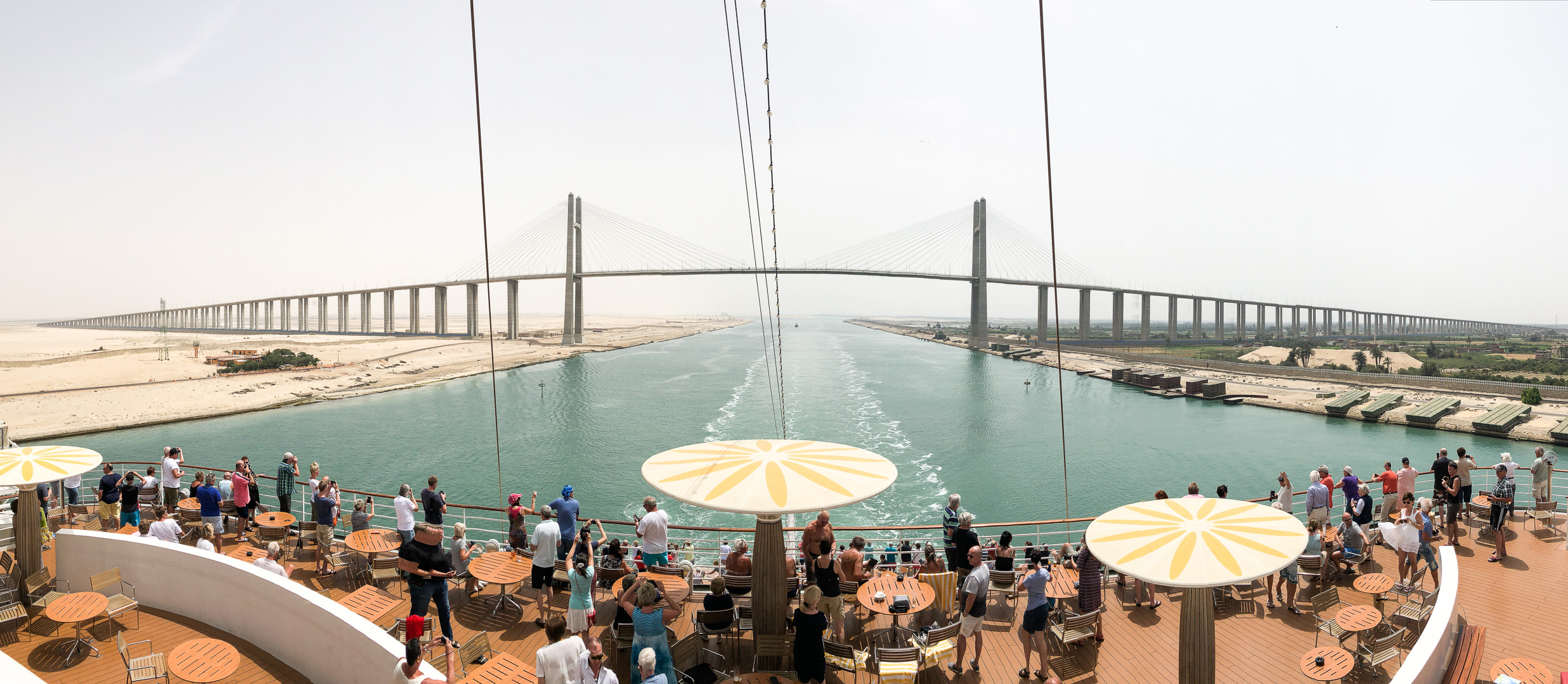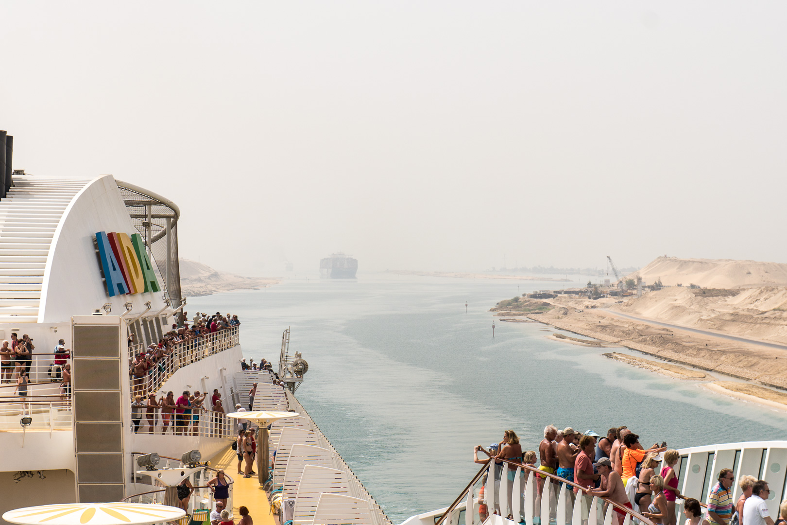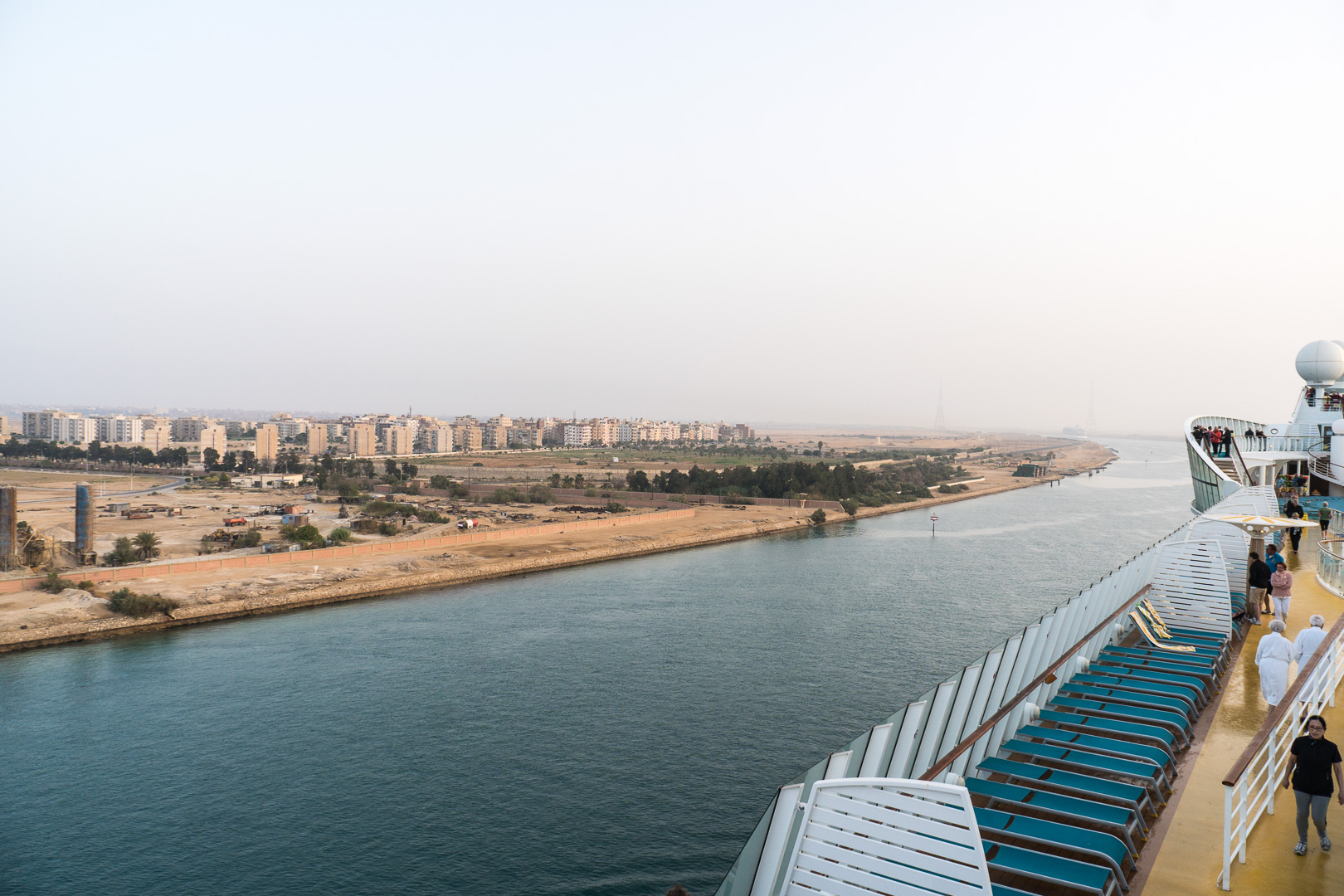 Schon nachts hatte sich unsere Stella in den Konvoi an vierter Position eingereiht und ab 06:00 Uhr morgens war das halbe Schiff auf den Beinen, um die Durchfahrt durch den 193 km langen Kanal mitzuerleben. Während der 10-stündigen Passage erlebten wir de facto eine Fahrt durch die Wüste, links das ägyptische Festland und rechts die Sinai-Halbinsel. Mal konnten wir Städte und landwirtschaftlich genutzte Flächen fotografieren, mal sahen wir nur Sand bis zum Horizont.