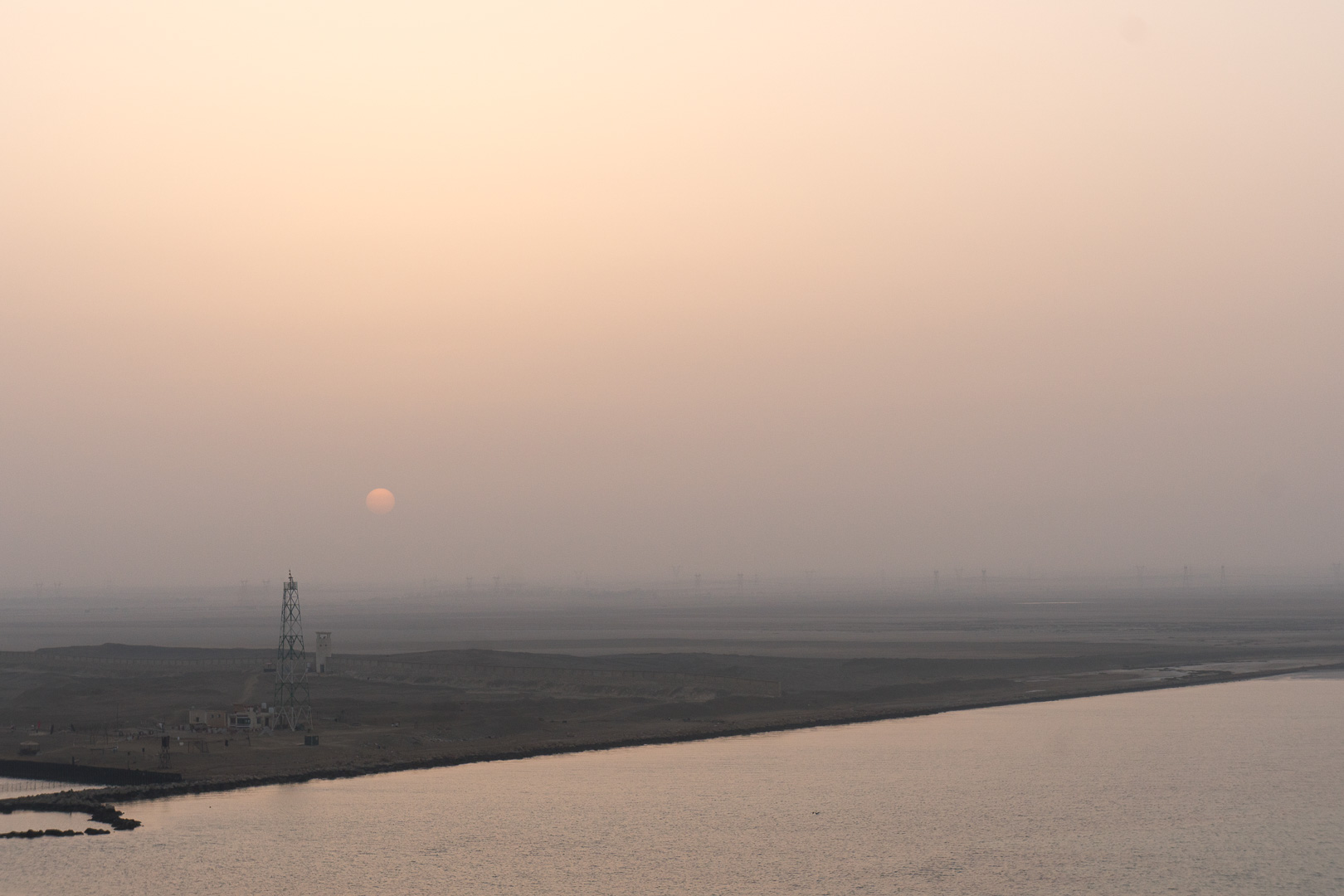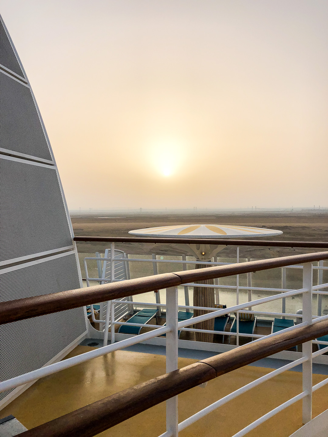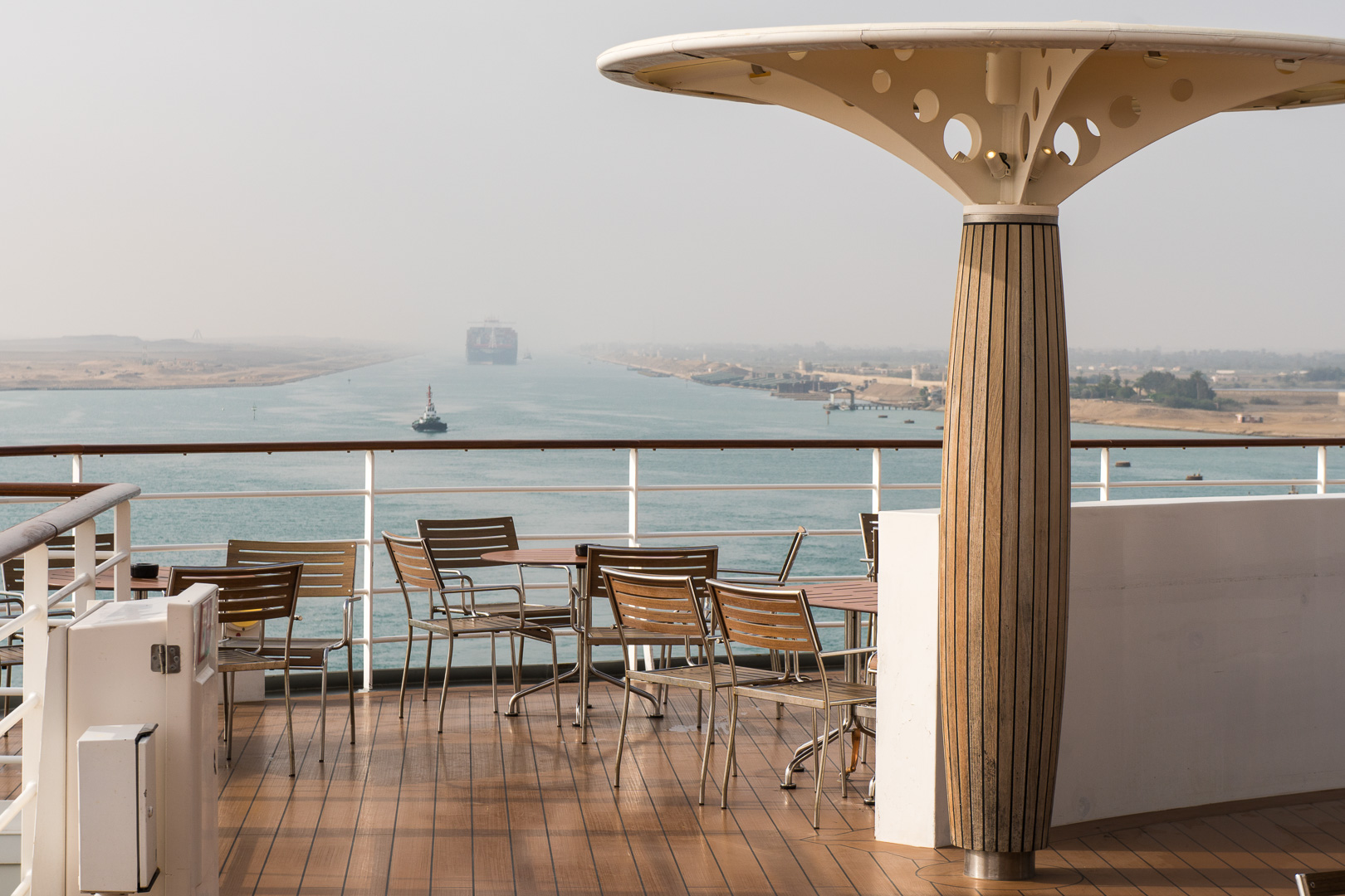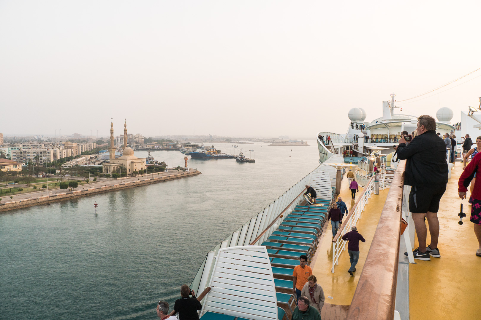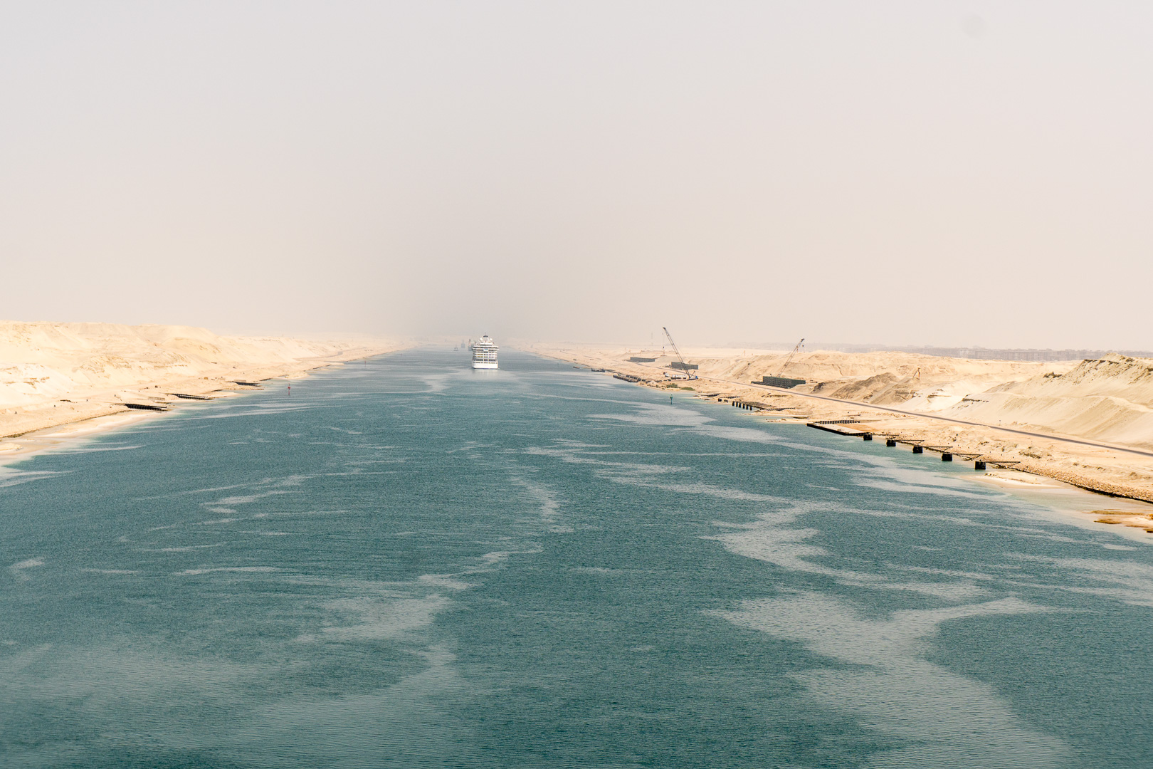 Schon nachts hatte sich unsere Stella in den Konvoi an vierter Position eingereiht und ab 06:00 Uhr morgens war das halbe Schiff auf den Beinen, um die Durchfahrt durch den 193 km langen Kanal mitzuerleben. Während der 10-stündigen Passage erlebten wir de facto eine Fahrt durch die Wüste, links das ägyptische Festland und rechts die Sinai-Halbinsel. Mal konnten wir Städte und landwirtschaftlich genutzte Flächen fotografieren, mal sahen wir nur Sand bis zum Horizont.
