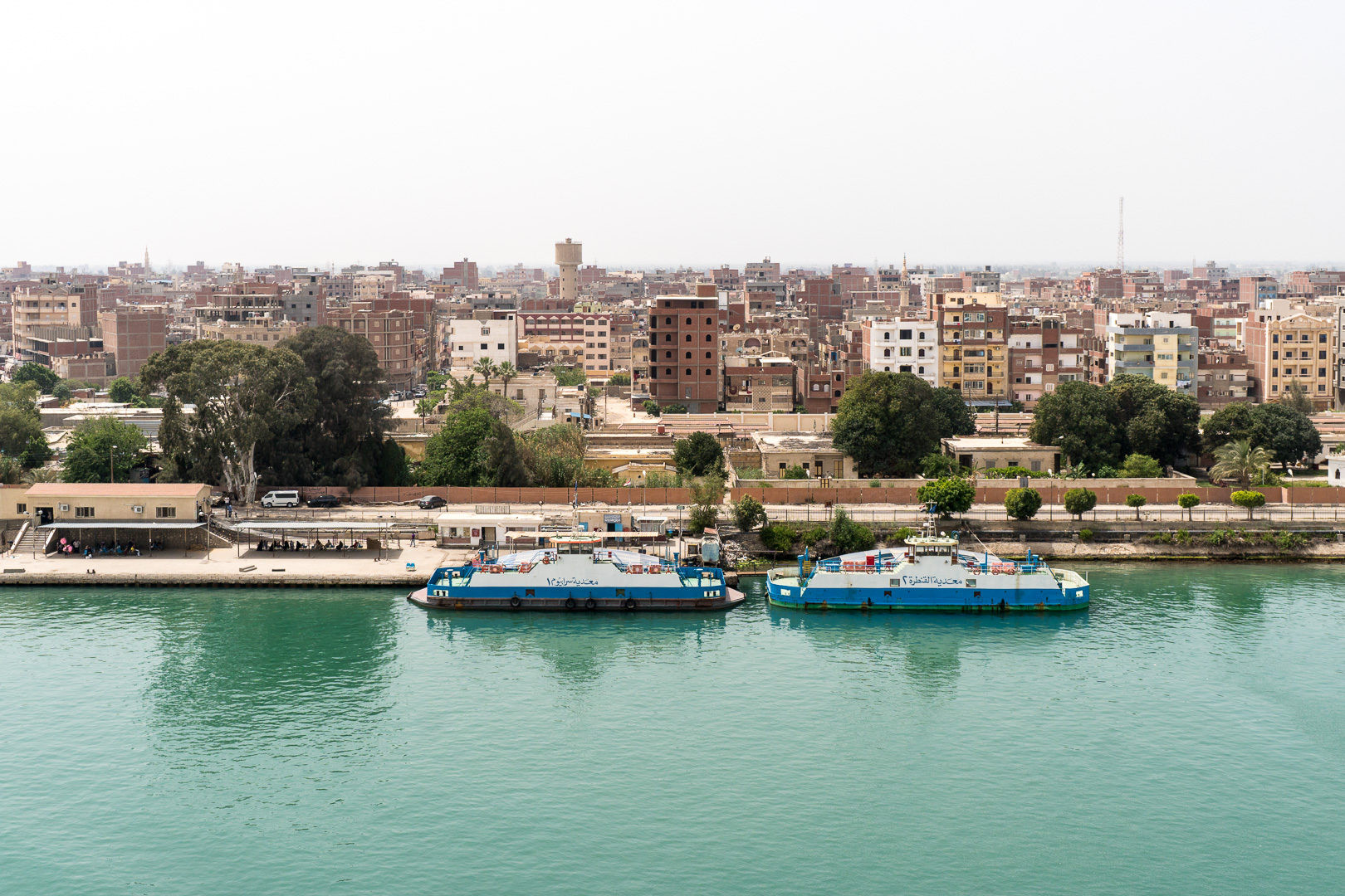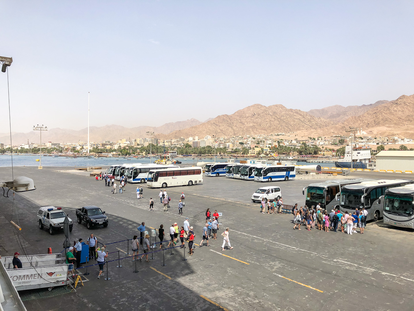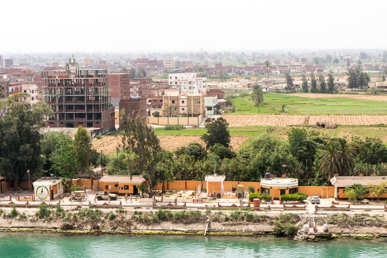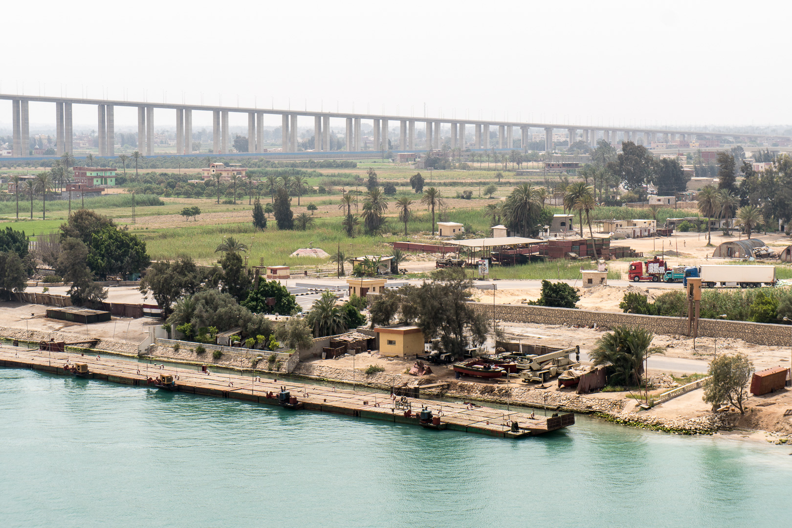 Schon nachts hatte sich unsere Stella in den Konvoi an vierter Position eingereiht und ab 06:00 Uhr morgens war das halbe Schiff auf den Beinen, um die Durchfahrt durch den 193 km langen Kanal mitzuerleben. Während der 10-stündigen Passage erlebten wir de facto eine Fahrt durch die Wüste, links das ägyptische Festland und rechts die Sinai-Halbinsel. Mal konnten wir Städte und landwirtschaftlich genutzte Flächen fotografieren, mal sahen wir nur Sand bis zum Horizont.