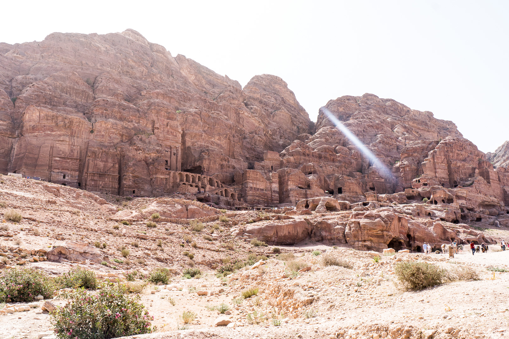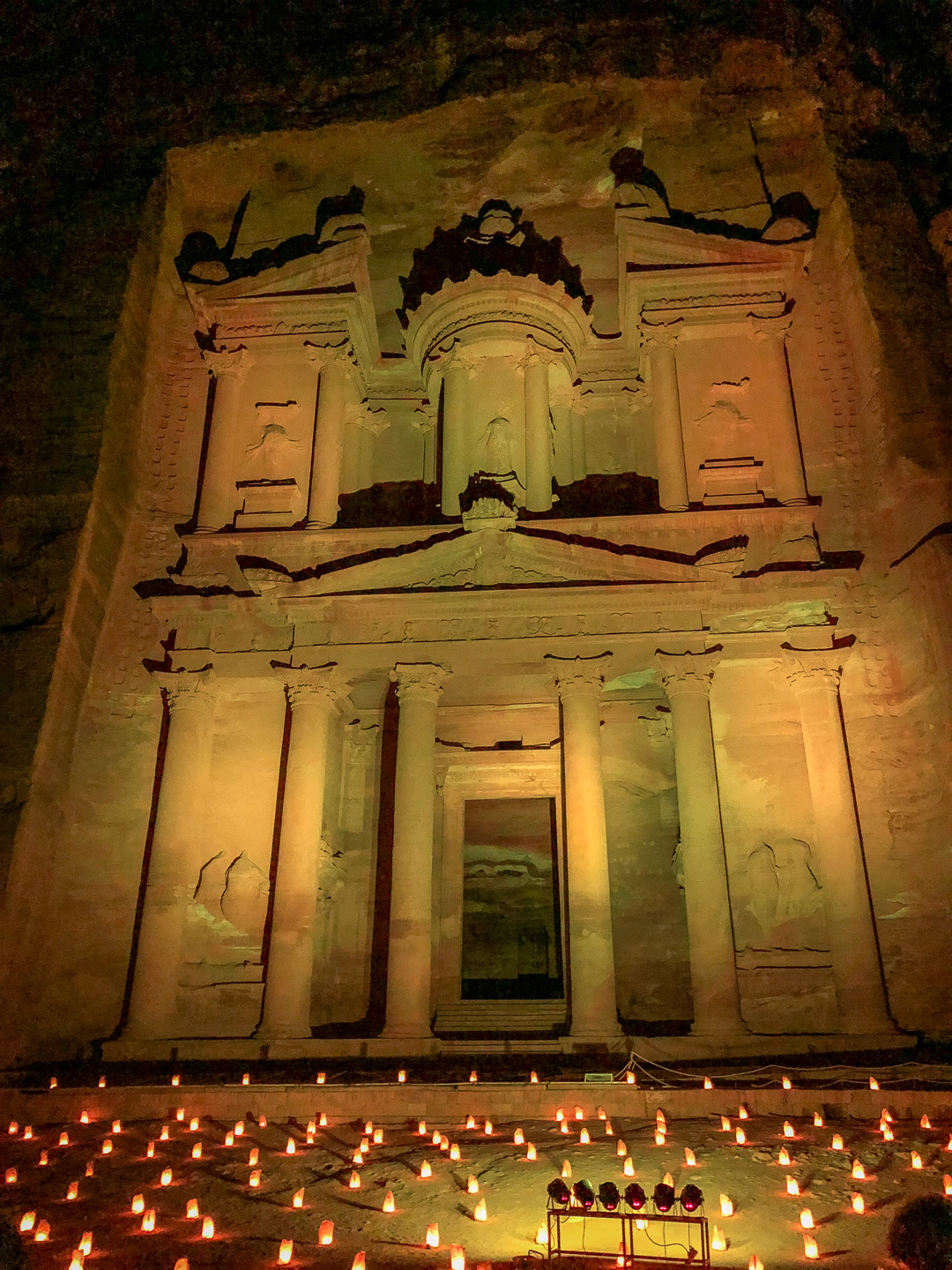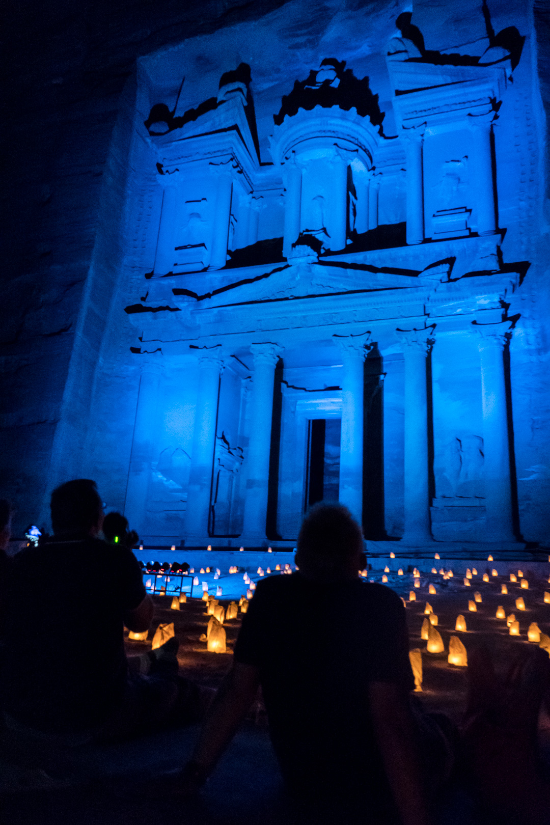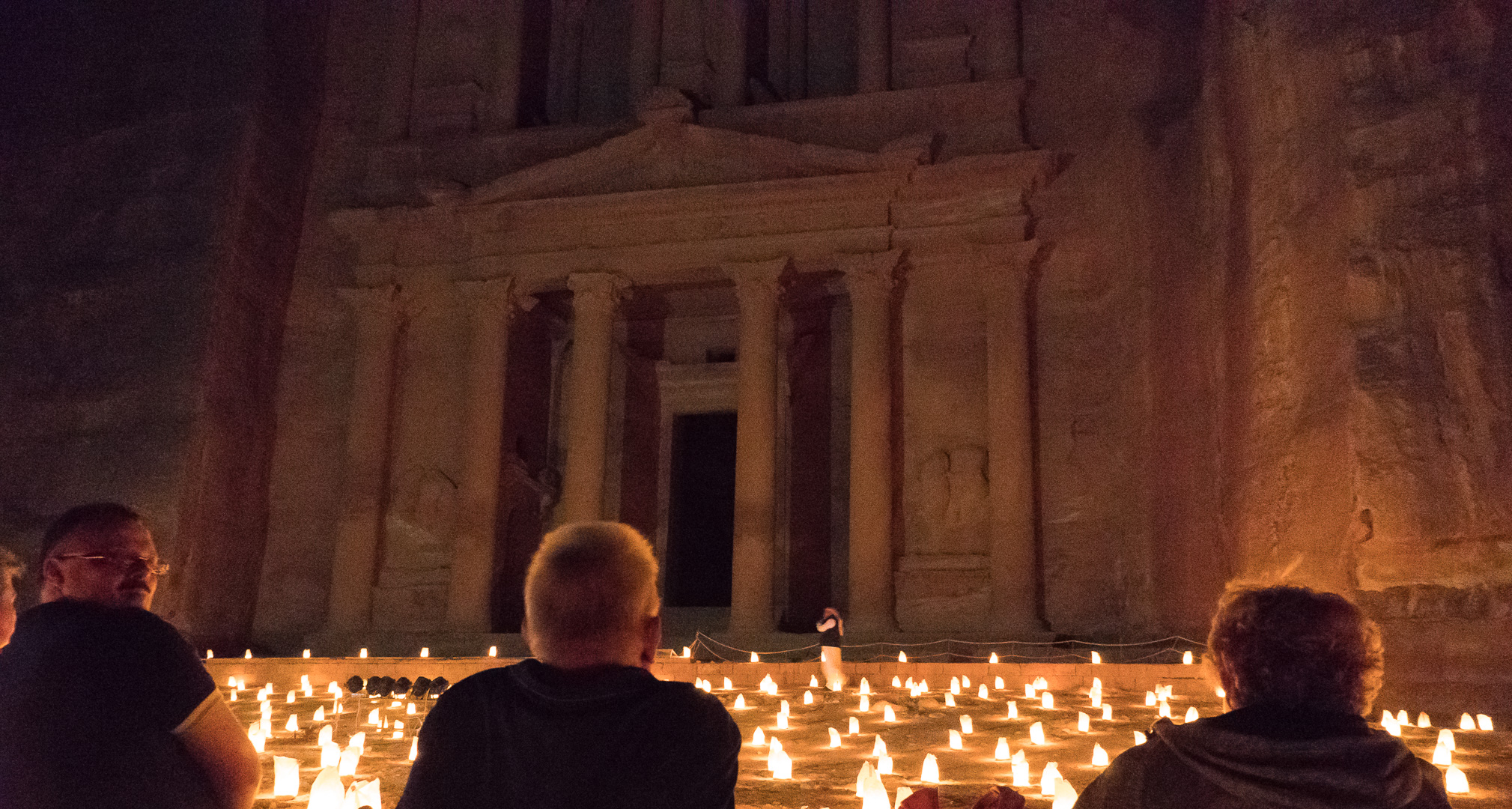 Die beste Entscheidung unseres Urlaubs war, den Besuch der nabatäischen Felsenstadt Petra mit einer Übernachtung vor Ort zu verbinden. So fuhren wir bereits am Nachmittag nach Ankunft im Hafen von Aqaba mit dem Bus durch die staubigen Berge auf eine Höhe von 1000 m ins jordanische Hinterland. Nach Check-in und kurzem Abendessen im Hotel direkt neben dem Besuchereingang zu Petra konnten wir dann bei angenehmen Temperaturen um 25°C bei einer exklusiven Veranstaltung mit einer überschaubaren Besucheranzahl dem Schatzhaus von Petra einen ersten Besuch bei Kerzenschein abstatten.