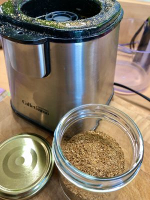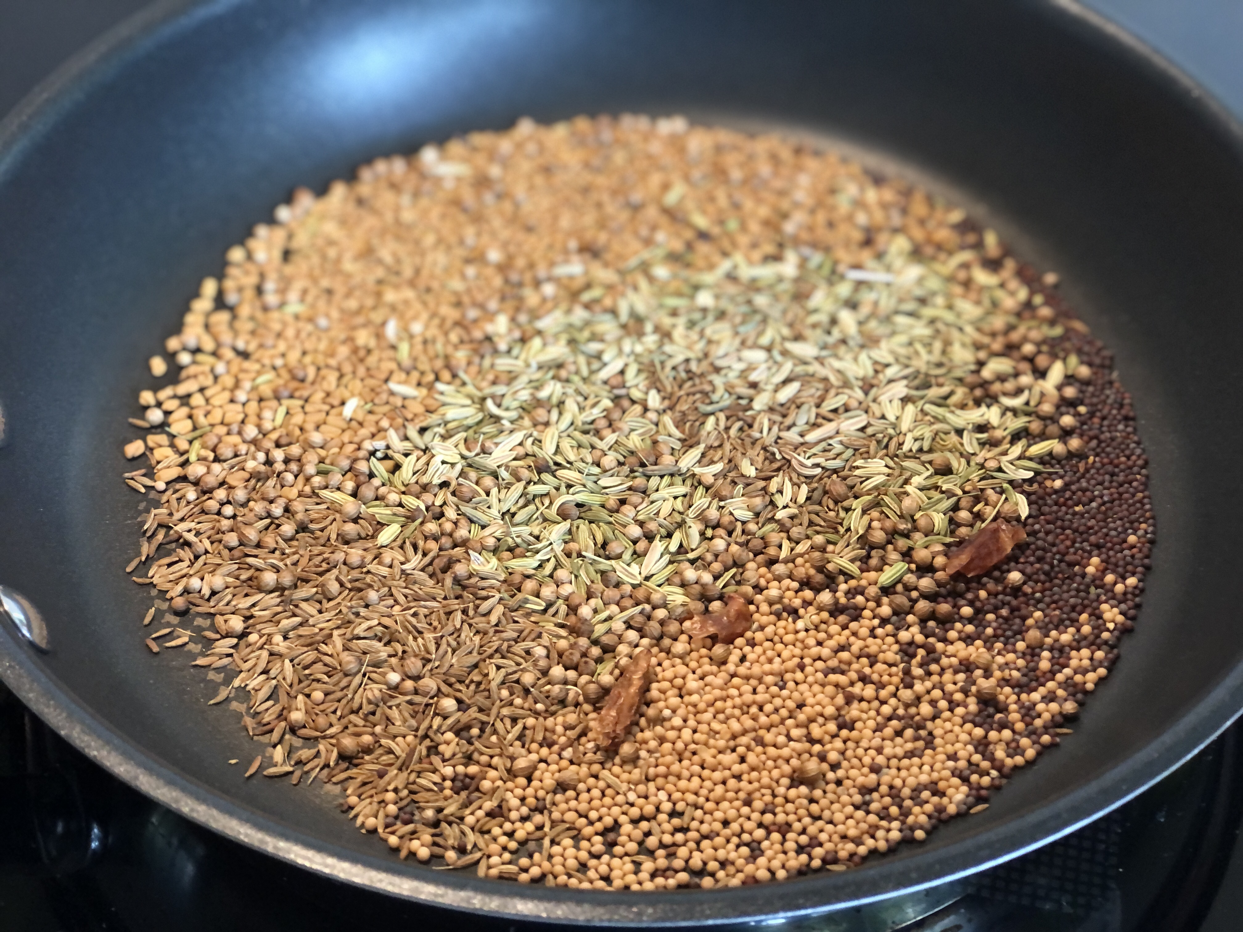 - Die Chilischoten zerbröseln und mit den anderen Gewürzen in einer heißen Pfanne ca. 4 Minuten rösten.