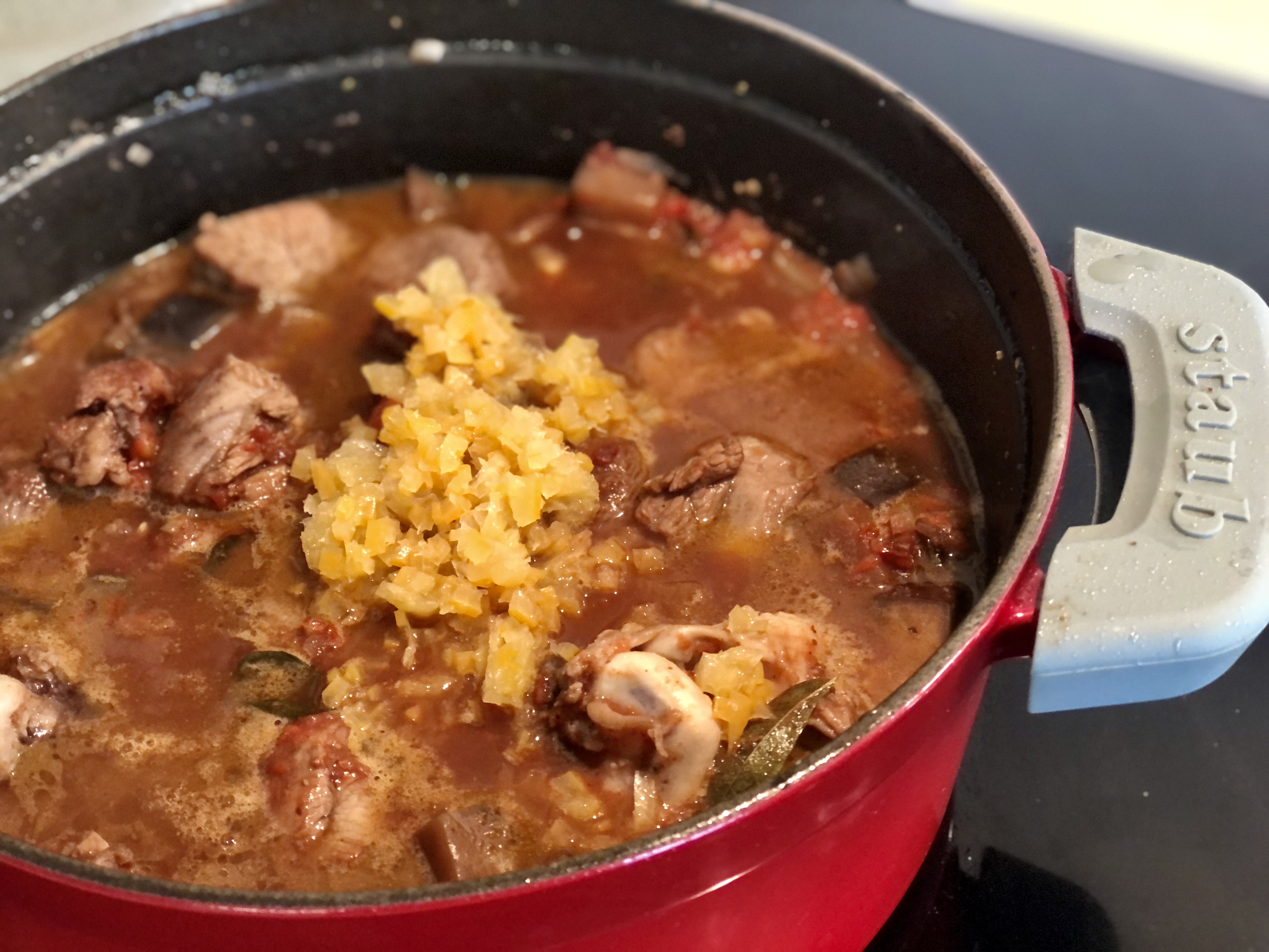 - Das Butterschmalz in einem Bräter zerlassen und die Fleischwürfel und den Knochen bei guter Hitze anbraten, bis sie Farbe haben. Nur so viel in den Topf geben, wie den Boden bedeckt, ggf. in mehreren Portionen anbraten.Das angebratene Fleisch beiseite stellen.