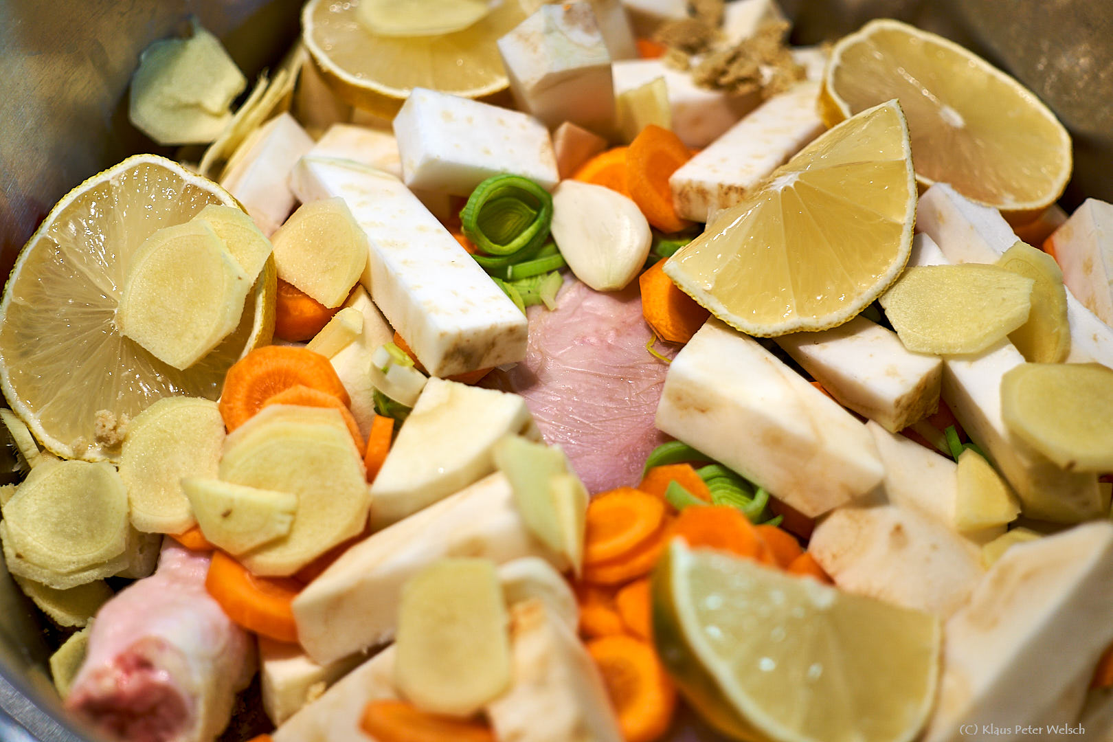 Optional Zitronengrasstängel putzen und Ingwer in dünne Scheiben schneiden. - Geschnittenes Gemüse mitsamt der gerösteten Zwiebel zum Huhn in den Topf geben.