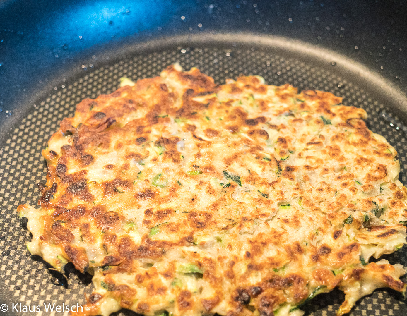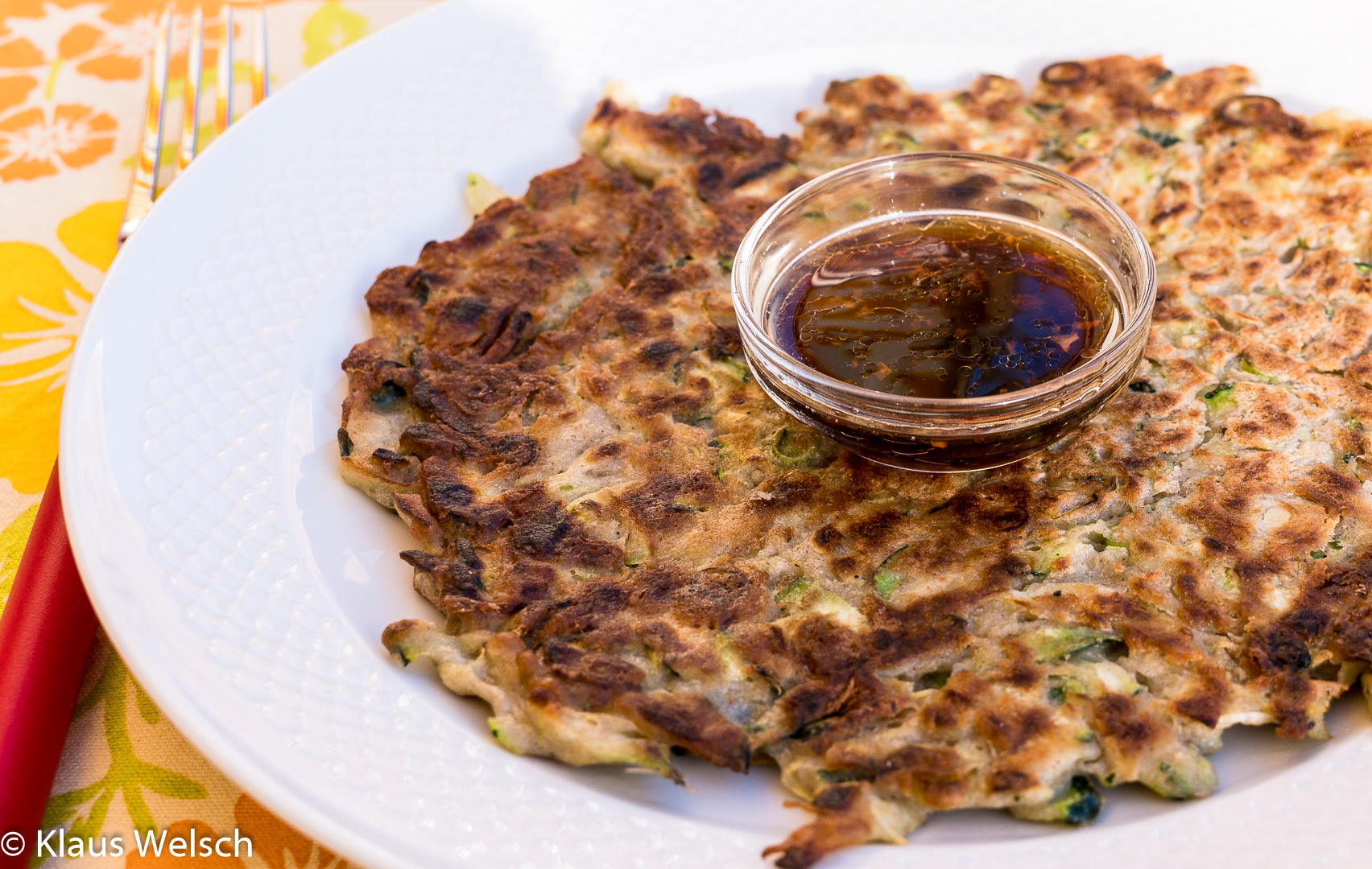 Kürzlich haben wir dieses Rezept empfohlen bekommen - und zufällig lagen da noch zwei Zucchinis in unserem Kühlscrank. Als schnelles Essen .. wieso nicht. Und was soll ich sagen: die Pfannkuchen waren seehr lecker. Insbesondere der Sojasauce-Reisessig-Dip gab dem Ganzen den richtigen Kick.