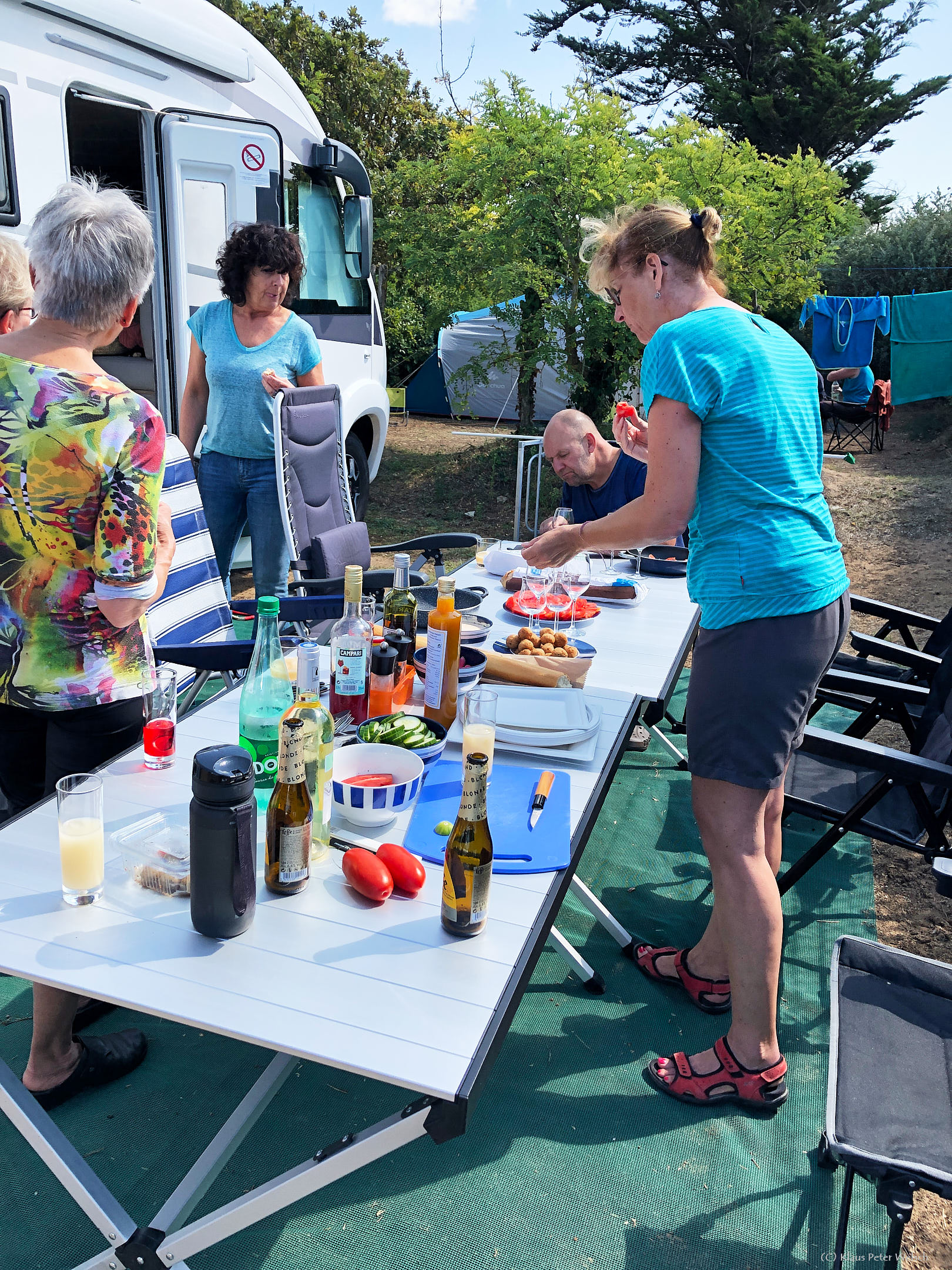 Die körperliche Aktivität war auch dringend erforderlich, um einen Ausgleich zu den opulenten Menüs der wunderbaren Restaurants, z.B. dem L´Estran, zu schaffen, in die uns Tina und Ingo mitnahmen. Dabei waren wir stets eine unterhaltsame und supernette Truppe, da neben Tina und Ingo auch die Platznachbarn und Freunde Jutta, Elke, Andrea und Harry vom Campingplatz Le Suroit mit von der Partie waren. Le Suroit liegt an der Westküste der Insel am Atlantik und war in der zweiten Urlaubswoche unser zu Hause.