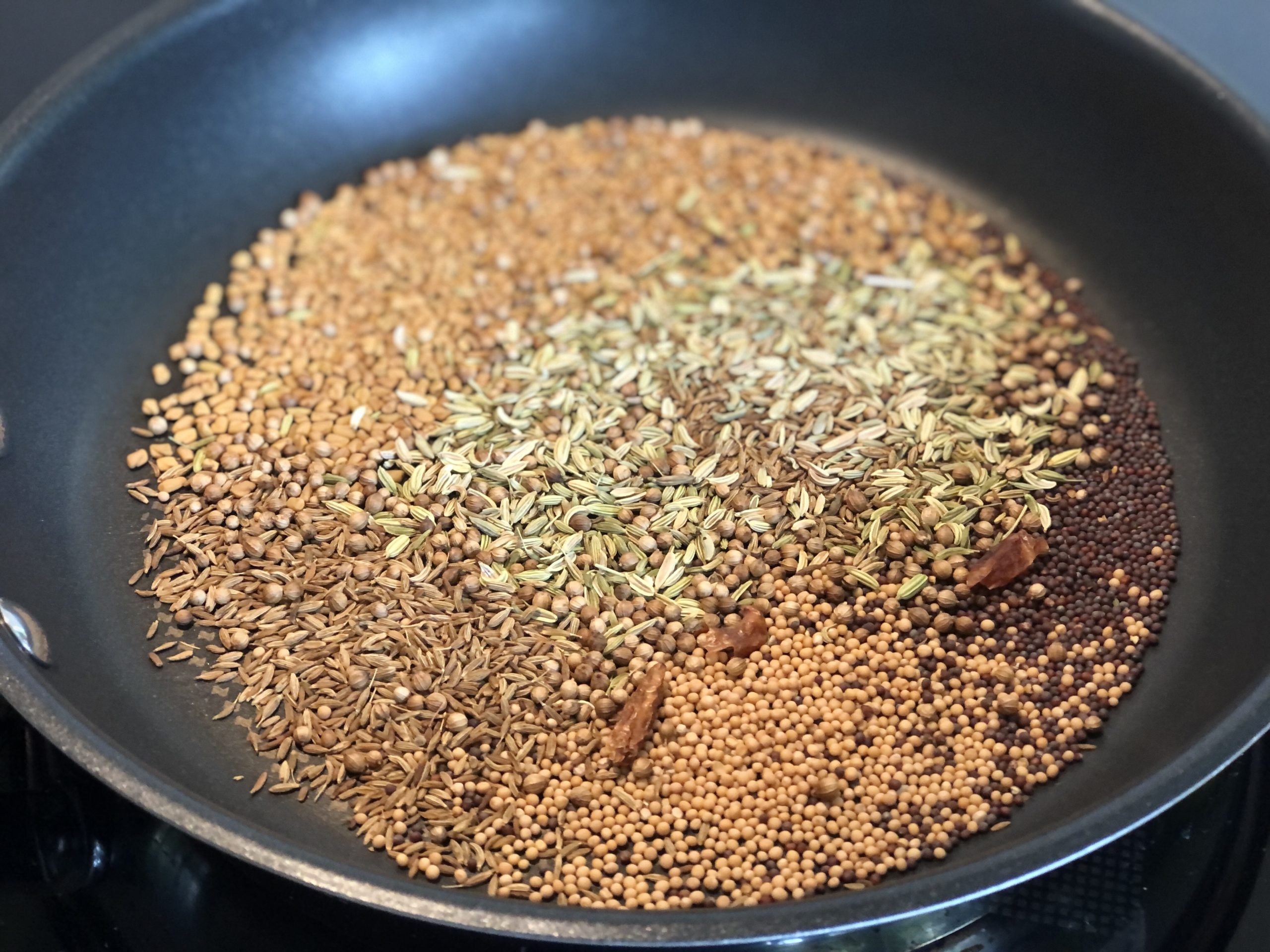 Die Chilischoten zerbröseln und mit den anderen Gewürzen in einer heißen Pfanne ca. 4 Minuten rösten.