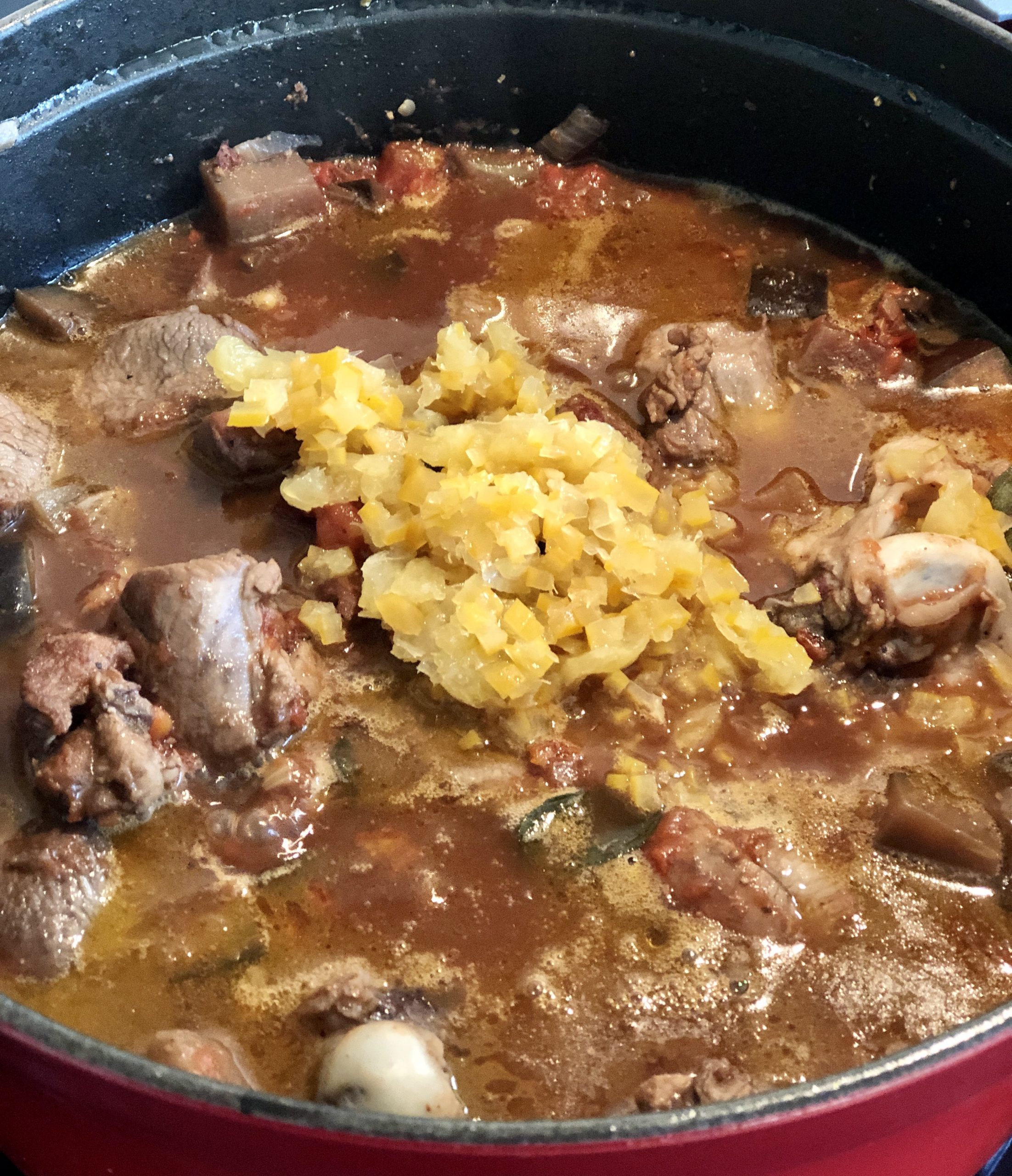 Das Butterschmalz in einem Bräter zerlassen und die Fleischwürfel und den Knochen bei guter Hitze anbraten, bis sie Farbe haben. Nur so viel in den Topf geben, wie den Boden bedeckt, ggf. in mehreren Portionen anbraten.Das angebratene Fleisch beiseite stellen.